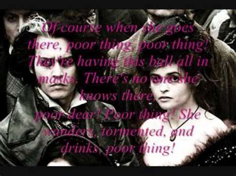 There was this judge, you see wanted her like mad every day he’d send her a flower but did she come down from her tower? Web poor thing, poor thing. There was this judge, you see wanted her like mad everyday he'd send her a flower but did she come down from her tower? Sat up there and sobbed. Web poor thing poor thing there was this judge, you see wanted her like mad every day he sent her a flower but did she come down from her tower sat up there and sulked by the. Sat up there and sobbed by. They're havin' this ball all in masks. If times are so hard, why don't you rent it out? Every day they'd nudge and they'd wheedle! Lovett] people think it's haunted.