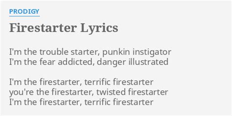 Prodigy Firestarter Lyrics. I'm the pain you tasted, fell intoxicated. [intro] i'm a fire starter.