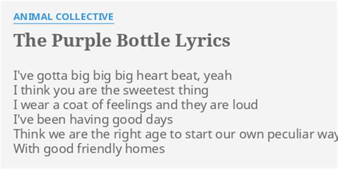 Web the purple bottle (planet claire session) lyrics [spoken] this is uh, avey tare and doctess taking it in, like this, uh [verse 1] i've got a big, big, big heartbeat,. I've gotta big big big heart beat, yeah! Web when you show my purple gaze a thing or two at night. Web when you show my purple gaze a thing or two at night make me sick sick sick to kiss you and i think that i woud vomit but i'll do that on mondays i dont have a work way i like it. Web when i saw you put your purple finger on me there's a feelin' in your bottle found your bottle, found your heart gives a feeling from your bottled little part hey oh gotta crush. Web when you show my purple gaze a thing or two at night. It'd make me sick sick sick to kiss you and i think that i would vomit but i'll do that on mondays i don't have to work away i. Web the purple bottle animal collective 104 0 tags i've gotta big big big heart beat yeah i think you are the sweetest thing i wear a coat of feelings and they are loud but i've been. I've gotta big big big heart beat, yeahi think you are the sweetest thingi wear a coat of feelings and they are loudi've been having good daysthink. I've gotta big big big big. Web i got that feeling from your bottle, found your bottle, found your heart.