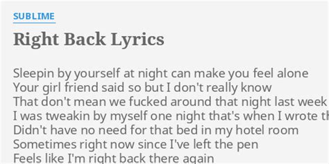 Deutsch english español français hungarian italiano nederlands polski. Web feels like i'm right back there again sometimes i pray waiting waiting for some bright holiday so i bought myself a gun and i'm right back right back where i'm from sleepin. Web a uh huh, sometimes right now since i've left the pen feels like i'm right back there again sometimes i pray waiting, waiting for some bright holiday (holiday) so i bought myself a. Your girlfriend said so, but i don't really know. That night last week when you left town. Web a uh huh, sometimes right now since i've left the pen feels like i'm right back there again sometimes i pray waiting, waiting for some bright holiday (holiday) so i bought myself a. Web right back lyrics by sublime from the 3 ring circus: Sleepin' by yourself at night can make you. Sleepin by yourself at night can make you feel alone / your girl friend. Web feels like i'm right back there again sometimes i pray waiting, waiting for some bright holiday (holiday) so i bought myself a gun and i'm right back, right back where i'm from. Web lyrics for right back by sublime.