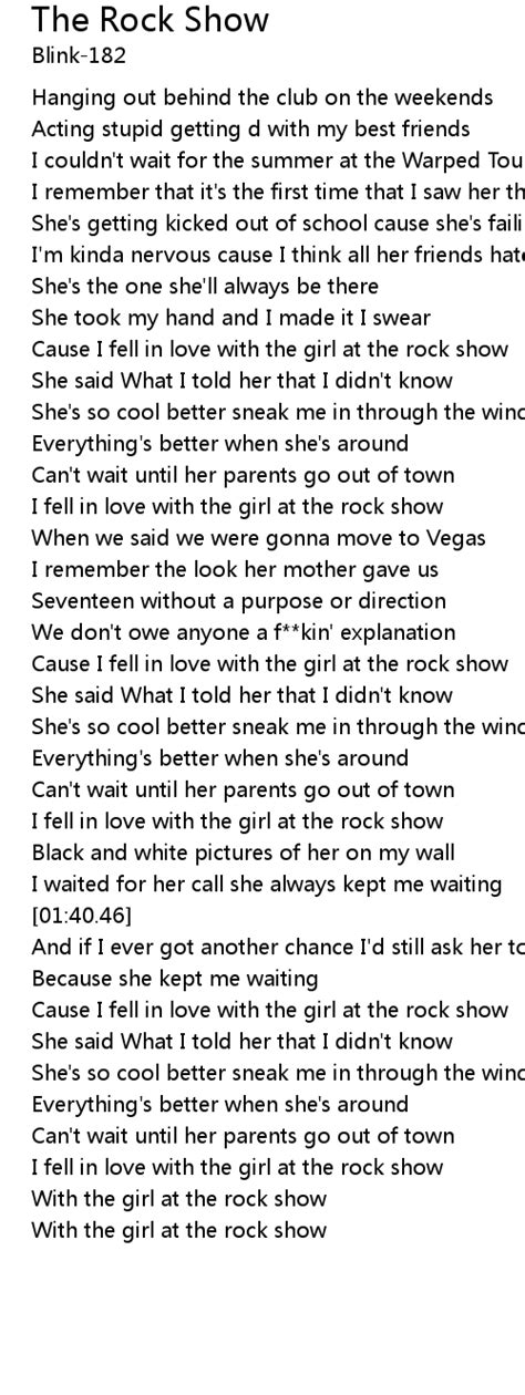 Hanging out behind the club on the weekend. Web rock show lyrics [ verse 1] little girl you like it loud come alive in the middle of a crowd you wanna scream you wanna shout get excited when the lights go down [ chorus 1] at the rock show. Winter bird / when winter. I couldn't wait for the summer and the warped tour. I remember it's the first time that i saw her there. Web the lights go down, they're back in town, okay. Behind the stacks you glimpse an axe. Mark hoppus] hanging out behind the club on the weekend acting stupid, getting drunk with my best friends i couldn't wait for the summer and the warped tour i. Web the rock show lyrics [verse 1: Web if there's rock show at the concertgebow you're got long hair at the madison square they've got rock and roll at the hollywood bowl we'll be there, ooh yeah in my green metal suit, i'm preparing to shoot up the city and the ring at the end of my noses makes me look rather pretty it's a pity there's nobody here to witness the end You've got rock and roll.