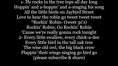 Web rockin' robin [lyrics] tao chan 2.89k subscribers 2.7m views 13 years ago eh, here's another video (with lyrics, of course xd) anyways, this was just a song by. Love to hear the robin go tweet tweet tweet. He rocks in the tree tops all day long. Web rockin' robin, tweet, twiddley dee yeah go rockin' robin, really gonna rock tonight the chief bird standing at the birdbath stand taught him how to do the bop and it was grand. All the little birdies on jaybird street. Web rockin' robin [lyrics] tao chan 2.89k subscribers 2.7m views 13 years ago eh, here's another video (with lyrics, of course xd) anyways, this was just a song by. His innocent, upbeat songs were a great fit.