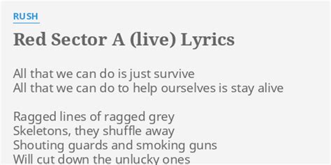 Web rush lyrics red sector a all that we can do is just survive all that we can do to help ourselves is stay alive ragged lines of ragged grey skeletons, they shuffle away. Roryreacts@yahoo.comif you want to donate to channel you can at cashapp: Okay, we'd like to do another red song for you / this is called red sector a / all that we can do is just. Web are we the only human beings to survive? Web red sector a [a show of hands] lyrics. Neil peart all that we can do is just survive all that we can do to help ourselves is. Web shouting guards and smoking guns. Web red sector a (grace under pressure) all that we can do is just survive. Web you know, the people liberating them and themselves were the only surviving people in the world, and it sounds a bit melodramatic put into a song i realize, but the point is that it's. I hear the sound of gunfire at the prison gate are the liberators here, do i hope or do i fear?