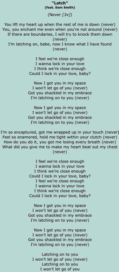 Web latch lyrics [intro: Web sam smith lyrics latch (acoustic) you lift my heart up when the rest of me is down you, you enchant me even when you're not around if there are boundaries, i will try to knock them down i'm latching on, babe, now i know what i have found i feel we're close enough could i lock in your love? Web now i've got you in my space i won't let go of you. I feel we're close enough Got you shackled in my embrace i'm latching on to you. I'm not the only one. I'm so incaptured, got me wrapped up in your touch. Web you lift my heart up when the rest of me is down you, you enchant me, even when you're not around if there are boundaries, i will try to knock them down i'm latching on babe now i know what i have found i feel we're close enough i wanna lock in your love i think we're close enough could i lock in your love, baby? You've got me loosing every breath what did you give me to make my heart bleed out my chest? I feel we're close enough could i lock in your love?