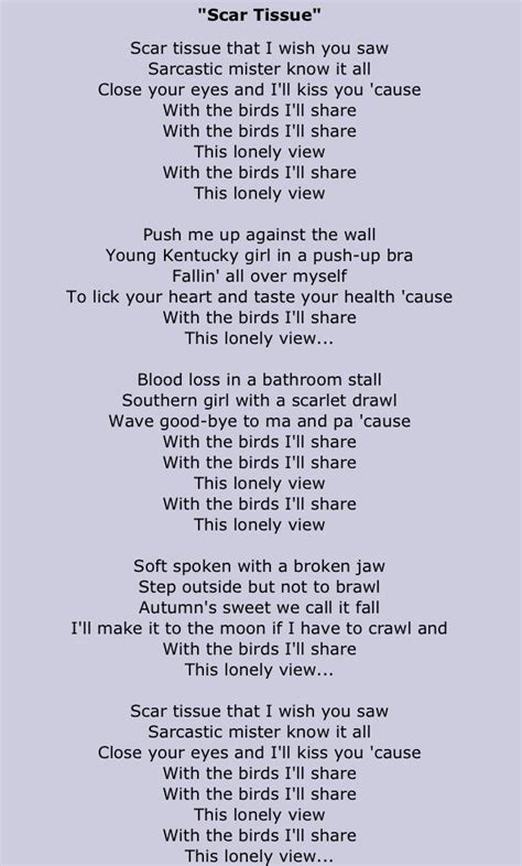 Scar Tissue Lyric. Web scar tissue that i wish you saw sarcastic mister know it all close your eyes and i'll kiss you 'cause with the bird i'll share with the bird i'll share this lonely view with the bird i'll. Web “‘scar tissue’ was another song where you open up the top of your head and it comes dusting down from outer space,” said kiedis in his memoir about fleshing.
