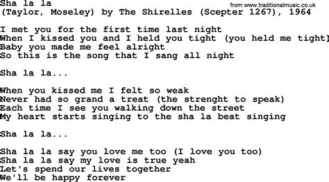 Sha La La Lyrics. On the floor we're singing sha la la and we need no more sha la la. My heart starts singing to the sha la beat singing.