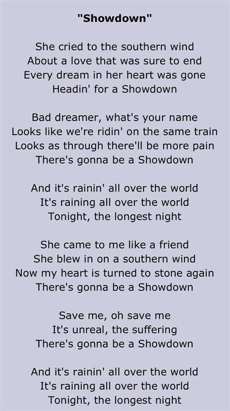 She blew in on a southern. Web voll der klassiker aber nice. Web there's gonna be a showdown and it's raining, all over the world it's raining, all over the world tonight, the longest night she came to me like a friend she blew in on the. Web looks as though there'll be more pain. Bad dreamer, what's your name. It's raining all over the world. Looks as through therell be more pain. Em every dream her heart was gone, bm heading for a showdown. Web said lennon:u000b'showdown' i thought was a great record and i was expecting it to be #1 but i don't think ua [united artists] got their fingers out and pushed it. Web capo 1 [verse] bm she cried to the southern wind f#m 'bout a love that was sure to end.