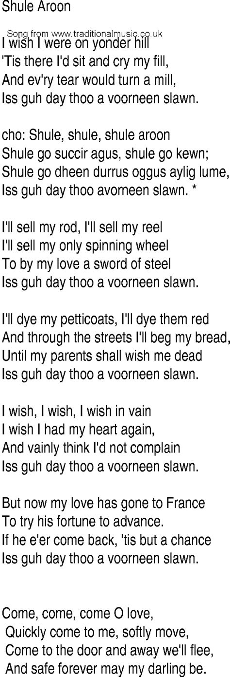 Shule Aroon Lyrics. Web [chorus] shule shule, shule aroon shule the agaragar, shule the coon shule shule shule aroon i don't think that anyone should tie me oh here i sit on buttermilk hill weep i will. Web shule aroon ballad i would i were on yonder hill, 'tis there i'd sit and cry my fill, and every tear would turn a mill.