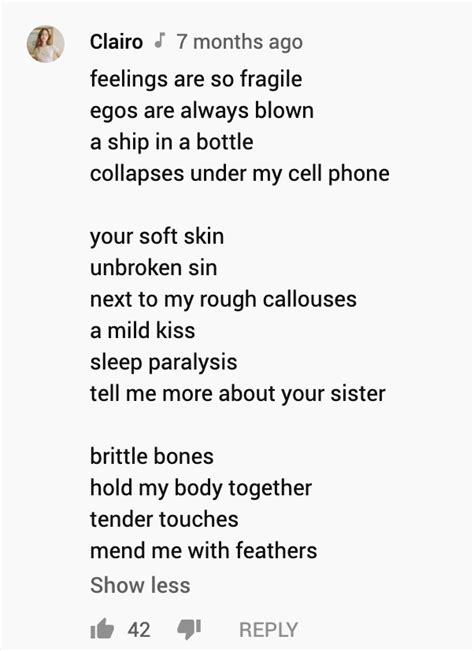 Sis Clairo Lyrics. Web feelings are so fragile egos are always wants ship in a bottle collapses on to myself oh your soft skin unbroken sin next to my rough calluses mild kiss, sleep paralysis tell me. Feelings are so fragile egos are always wantsship in a bottle collapses on to myself oh your soft skin unbroken sin next to my rough calluses mild kiss, sleep.