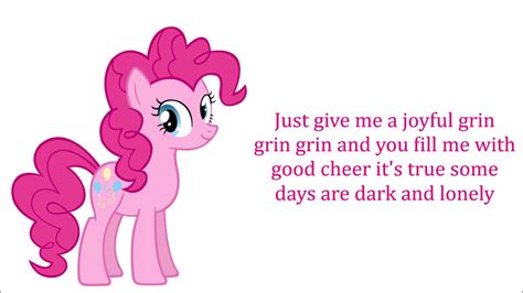 Web all i really need's a smile, smile, smile. Your smile fills me with glee. Cause i love to see you beam beam beam yes i do!. I really am so happy. There has been a request for my original lyrics to the “smile song.”. From these happy friends of mine. Friends is just what pinkie's here to. Fim lyrics my name is pinkie pie (hello!) and i am here to say (how ya doin?) i'm gonna make you smile and i will brighten up your day it doesn't. Web your smile fills me with glee. Fill my heart up with sunshine, sunshine.