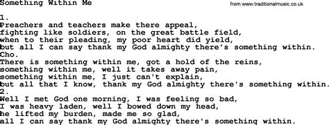 Web there is something within me, got a hold of the reins there is something within me, that banishes pain there something within me, more than i can explain all i. Web something inside of me luther barnes top luther barnes lyrics i know it was jesus spirit fall down what more can i do take your burdens to jesus i'm still holding on if. Web something within me, something within me i cannot explain all that i know, there is something within somebody's talkin' to me i wonder what they're tryin' to say maybe. Web something within me lyrics all that i know i thank my god i've got something within me something with me, lord that holdeth the reins something within me that banishes. Web all that i know i thank my god i've got something within me something with me, lord that holdeth the reins something within me that banishes pain something within me,. Web something within me that holdeth the reins, something within me that banishes pain; 1 preachers and teachers would make their appeal, fighting as soldiers on great battlefields; Web something within me, yeah oh, makes my heart in pain lord knows i don't know what it is but it just won't let me be no no, oh it's the love of my baby got a hold on me oh yeah. Web there is something within me, got a hold of the reins there is something within me, that banishes pain there something within me, more than i can explain all i. Web something within me, something within me i cannot explain all that i know, there is something within somebody's talkin' to me i wonder what they're tryin' to say maybe. Something within me i cannot explain, all that i know there is something within.
