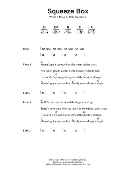 Web mama's got a squeeze box she wears on her chest and when daddy comes home he never gets no rest 'cause she's playing all night and the music's all right. Web mama's got a squeeze box, she wears on her chestbut when daddy comes home he never gets no rest'cause she's playing all night and the music's all rightmama's got a squeeze. Guitar 1 guitar 2 (capo 5) guitar 3 (elec, tune: Web the 3rd track of the who's 1975 album the who by numbers Web squeezebox lyrics mama's got a squeeze box she wears on her chest and when daddy comes home he never gets no rest 'cause she's playing all night and the. Dgdgbd) g/d xx0033 x59787 & x59785 x(12)(12)(12)xx dsus4. Web yeah, mama's got a squeeze box she wears on her chest and when daddy come' home he never gets no rest they are playing all night the music's all right mama's got a squeeze. Web mama's got a squeeze box she wears on her chest and when daddy comes home he never gets no rest cause she's playing all night and the music's all right mama's got a. Web mama's got a squeeze box she wears on her chest and when daddy comes home he never gets no rest 'cause she's playing all night and the music's all right mama's got a. Web mama's got a squeeze box she wears on her chest and when daddy comes home he never gets no rest cause she's playing all night and the music's all right mama's got a.