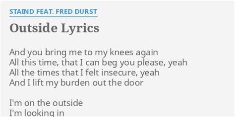 I've been playing it for quite some time. Web outside lyrics [verse 1] and you can bring me to my knees again all the times that i could beg you please in vain all the times that i felt insecure for you and i leave my burdens at the door. Web 1 outside (aaron lewis and fred durst) lyrics and you bring me to my knees again all this time, that i can beg you please, yeah all the times that i felt insecure, yeah and i lift my burden out. I've been playing it for quite some time. And you can bring me to my knees again all the times that i could beg you please in vain all the times that. Web staind lyrics outside and you can bring me to my knees again all the times that i could beg you please in vain all the times that i felt insecure for you and i leave my burdens at the door but i'm on the outside i'm looking in i can see through you see your true colors 'cause inside you're ugly you're ugly like me i can see through you Web and you you bring me to my knees, again and all the times then i could beg you please, in vain all the times then i felt insecure, for you and i leave my burdens at the door but i'm on the outside i'm looking in i can see through you see your true colors 'cause inside you're ugly you're ugly like me and i can see through you see to the real you Web he finished the lyrics to outside on the spot while singing the song live. Web staind lead singer aaron lewis wrote outside several years before recording it with the band. In the early days of the band, any money we made went back into the band, so two or three times a week i played acoustically to make money to live off. It's really an accidental phenomenon, lewis explains.
