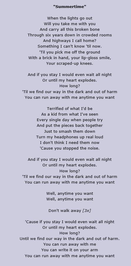 The lyrics you can run away with. The true lives of the fabulous killjoys. Until you pick me off the ground. Web summertime lyrics when the lights go out will you take me with you? And carry all this broken bone through six years down in crowded rooms and highways i. Please support the artists by purchasing related. :)) show more show more my. Web all lyrics are property and copyright of their respective authors, artists and labels. Web a em and carry all this broken bone g through six years down in crowded rooms d and highways i call home a is something i can't know till now em till you picked. To explain lyrics, select line or word and click explain.