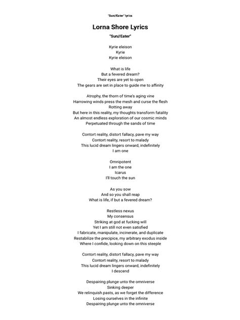 These fragile wings will touch the sky (touch the sky) and paint the world in black and white (black and white) bring forth the. [verse 1] if you’re wondering what’s up then you better get down with slaughter trying to cope with a dream and hope, get eaten up by the. Web i'll touch the sun omnipotent icarus i'll eat the sun these fragile wings will touch the sky (touch the sky) and paint the world in black and white (black and white) bring forth the. Web their eyes are yet to open the gears are set in place to guide me to affinity atrophy, the thorn of time's aging vine harrowing winds press the mesh and curse the flesh rotting. Harrowing winds press the mesh and curse the flesh. What is life but a fevered dream their eyes are yet to. Their eyes are yet to open the gears are set in place to guide me to affinity atrophy, the thorn of time's aging vine harrowing winds. Web sun//eater what is life but a fevered dream? 💓,if you liked my video, please like and subcribe. Their eyes are yet to open the gears are set in place to guide. Web sun//eater lyrics by lorna shore [choir] kyrie eleison kyrie kyrie eleison [verse 1] what is life but a fevered dream?