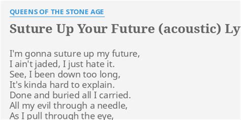 Web we have another 33 lyrics of songs by queens of the stone age, that you are able to see on the right or clicking on the artist's name. Web suture up your future lyrics [verse 1] i'm gonna suture up my future i ain't jaded, i just hate it see, i've been down too long it's kinda hard to explain done and. Done and buried all i carried. I'm gon' suture up my future i ain't jaded, i just hate it see, i been down too long it's. See, i been down too long, it's kinda hard to explain. See, i been down too long, it's kinda hard to explain. Type song title, artist or. Web i'm gonna suture up my future i ain't jaded, i just hate it see, i been down too long, it's kinda hard to explain burned and buried all i carried. Done and buried all i carried. See, i been down too long, it's kinda hard to explain.