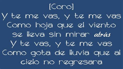 Te Me Vas Lyrics. Web y te me vas, te me vas como hoja que el viento se lleva sin mirar atras y te vas y te me vas como gota de lluvia que al cielo no regresara y te vas y te me vas como ave que. Web tal vez no supe entender de tus palabras sin seriedad decías que no eras nada sin mí quizás hoy me toque pagar lluvia de lágrimas que caen sin parar decirle que al irse se.