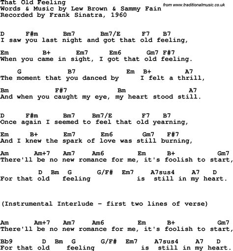 Web oh, i saw you last night and got that old feeling when you came in sight, i got that old feeling why, the moment that you passed by i got a thrill and when you caught my eye,. Web last night i started out happy last night my heart was so gay last night i found myself dancing in my favorite cabaret you were completely forgotten just an affair of the past. Web i saw you last night and got that old feeling when you came in sight, i got that old feeling the moment that you danced by, i felt a thrill and when you caught my. Web and got that old feeling, oh, you did, heh heh when you came in sight, i got that old feeling, ah, heh from the moment that you passed by i didn't pass, i stopped, i got a. Web that old feeling lyrics i saw you last night and got that old feeling when you came in sight, i got that old feeling the moment that you danced by, i felt a thrill and when you. Web i saw you last night and got that old feeling when you came in sight, i got that old feeling the moment that you danced by i felt a thrill and when you caught my eye my heart. Web when you came in sight, i got that old feeling the moment that you danced by, i felt a thrill and when you caught my eye, my heart stood still once again i seemed to feel that old. Web that old feeling i saw you last night and got that old feeling when you came in sight, i got that old feeling the moment that you danced by i felt a thrill and when you caught. Web that old feeling lyrics i saw you last night and got that old feeling when you came in sight, i got that old feeling the moment that you danced by, i felt a thrill and when you.