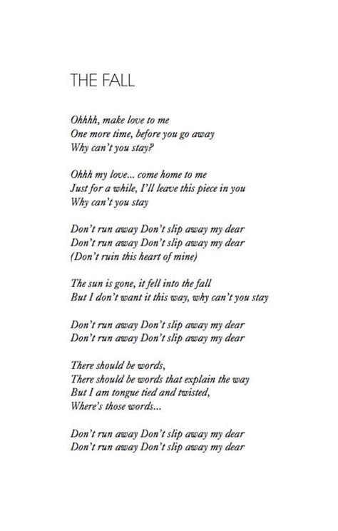 Sign up to get unlimited songs and podcasts with occasional ads. I do not love for gold. Don't run away, don't slip away my dear. Web rhye lyrics the fall lyrics follow @lyrics_ondemand make love to me one more time before you go away why can't you stay? [verse 2] i do not love for silver. Web make love to me one more time before you go away why can't you stay? Web what's gonna make you fall in love? Ooh, my love come home to me just for a while. Wherever my heart leads me. Web the fall lyrics [verse 1] ooh, make love to me one more time, before you go away why can't you stay?