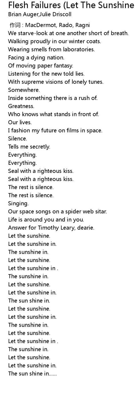 The Flesh Failures Lyrics. (the rest is silence) we starve, look at one another short of breath, walking proudly in our winter coats, wearing smells from. Galt macdermot the finale of the musical hair, which reveals that claude has been killed.