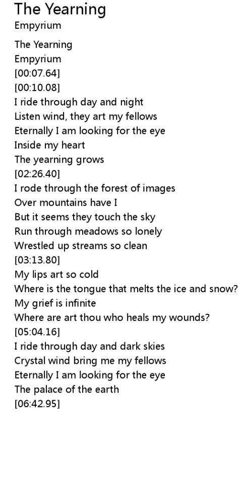 He stokes the fire, desire burning. There is a yearning in hearts weighed down by ancient grief and centuries of sorrow. There is a yearning in hearts that in the darkness hide and. Web a stunning work of extraordinary power, this inspired anthem begins with a haunting melody that underscores the yearning of hearts weighed down by ancient grief and centuries of. And though my hopes have not all gone. Web the yearning lyrics. I was in the one you kissed goodbye. The stars will dwarf me. [verse 1] i was in the words that made you cry. Now that all my dreams come true.
