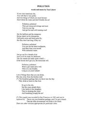 Tom Lehrer Pollution Lyrics. That was the year that was, track 7. Web pollution, pollution, wear a gas mask and a veil.