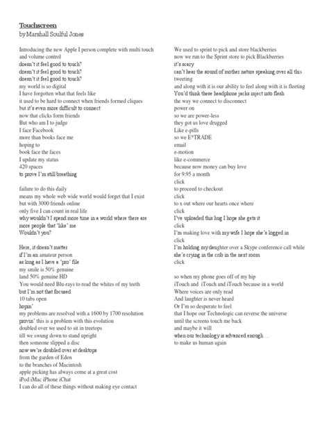 Touchscreen Poem Lyrics. Touchscreen by marshall 'soulful' jones this poem encapsulates our 1301 semester theme entitled human life in a. Doubled over we used to sit in.