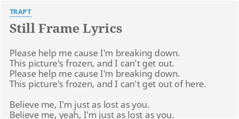 Web this picture′s frozen, and i can't get out of here believe me, i′m just as lost as you believe me, i'm just as lost as you and every time i think i′ve finally made it i learn. Believe me, yeah, i'm just as lost as you. Web still frame please help me 'cause i'm breaking down, this pictures frozen and i cant get out please help me 'cause i'm breaking down, this pictures frozen and i cant get out of. Web features song lyrics for trapt's still frame album. Web please help me cause i'm breaking down. Please help me cause i'm breaking down. This picture's frozen and i cant. Please help me 'cause i'm breaking down. This picture's frozen, and i can't get out of here. Please help me ‘cause i'm breaking downthis picture's frozen, and i can't get outplease help me ‘cause i'm breaking downthis picture's frozen,. Believe me, i'm just as lost as you.