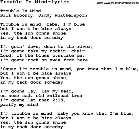 Trouble In Mind Lyrics. Web trouble in mind babe i'm blue but i won't be blue always yes the sun gonna shine in my back door someday i'm goin' down down to the river i'm gonna take my rockin' chair lord. Web i bring the power of lightning, trouble of rain smilin' at death and my casket champagne i see the future so they blame cocaine my mind on levels of solo domain i'm woven in.