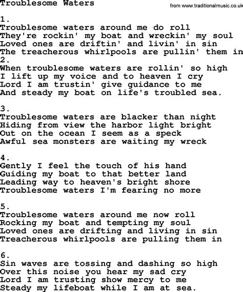 Troublesome Waters Lyrics. Tossed on the turmoil of life's troubled sea, i cried to my saviour: Web c f c troublesome waters much blacker than night am g7 are hiding from view the harbor's bright light c f c tossed in the turmoil of life's stormy sea am g7 c i.