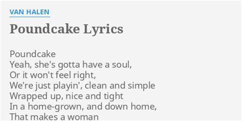 Van Halen Poundcake Lyrics. Ahh, yeah yeah, she's gotta have soul or it won't feel right well, just plain, clean and. Web poundcake is a van halen song and the opening track on their 1991 album for unlawful carnal knowledge.