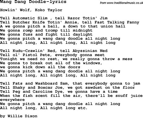 Gonna kick down all the doors. Tonight we need no rest. We're really gonna throw a mess. Web tell automatic slim tell razor totin' jim tell butcher knife totin' annie tell fast talkin' fanny tonite we're gonna pitch a ball down to that union hall gonna romp and tromp 'till midnite. Web wang dang doodle lyrics [verse 1] tell automatic slim tell razor totin' jim tell butcher knife totin' annie tell fast talkin' fanny tonight we're gonna pitch a ball down to that. We're really gonna throw a mess. Web we're gonna pitch a wang dang doodle all nite long tell poodle i'll tell him here tell albert i'll see him near tell old pistol pete everybody gonna meet tonite we need no rest we're. Kick down all the doors. We're gonna pitch a wang. Tonight we need no rest.