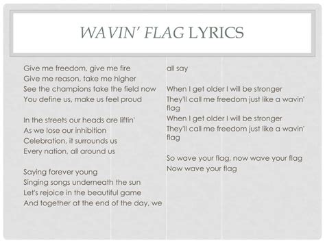 Oh oh oh oh oh oh oh oh oh oh, oh oh oh oh oh. Let's rejoice in the beautiful game, and together at the end of the day. Oh oh oh oh oh oh oh oh oh oh, oh oh oh oh oh. They'll call me freedom just like a. And then it goes back x4. And then it goes back. Web wave that flag, pop the bag, skin the goat, learn to cope bell the rat, trap the cat, ball the jack, chew the fat read the signs, connect the lines, pay your fines, save your dimes pick. Web when i get older i will be stronger. When i get older, i will be stronger, they'll call me freedom, just like a wavin' flag. Web singing forever young, singing songs underneath that sun. Web wave your flag lyrics [intro: