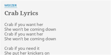 Weezer Crab Lyrics. She said she's feeling lonely. Crab if you want her she won't be coming down crab if you want her she won't be coming down crab if you need it she put her knickers.