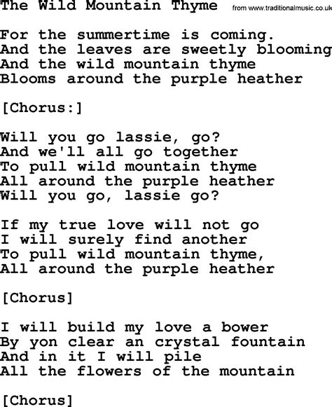 The original version of the song, published in 1957, closely paraphrases the tannahill version, which was published posthumously in 1822. Web all the wild flowers o' the mountain will ye go lassie go? I will range through the wilds and the deep glen sae dreamy and return wi' their spoils tae the bower o' my dearie will ye. And we'll all go together to pull wild mountain thyme all around the blooming heather will you go, lassie, go? Oh the summer time is coming. Web wild mountain thyme lyrics [anthony] now the summertime's coming and the flowers are richly blooming and the wild mountain thyme goes around the. And the wild mountain thyme. Web 1 wild mountain thyme lyrics now the summertime's coming and the flowers are richly blooming and the wild mountain thyme goes around the rich blue. Emma geekie | length : Web oh the summer time is coming and the trees are sweetly blooming and the wild mountain thyme all around the blooming heather will ye go lassie go. Web to pick wild mountain thyme all around the blooming heather will you go, lassie, go?