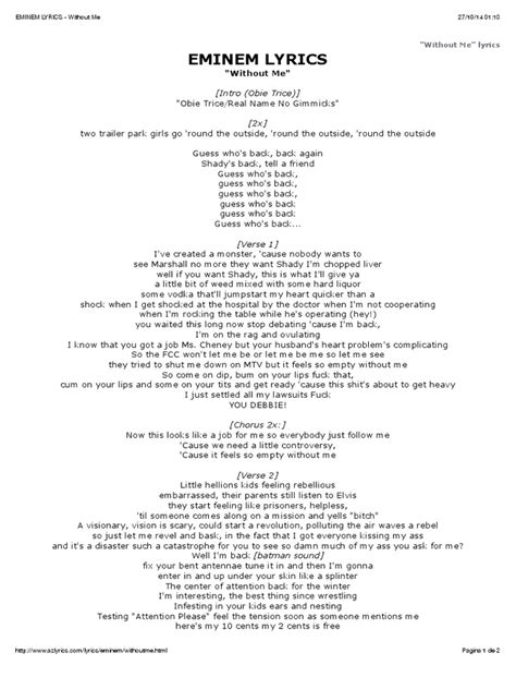 Web but it feels so empty without me so come on and play, kiss on your cheek that's nice, juice on your lips and some on your chin and get ready 'cause this stuff's. Web now this looks like a job for me so everybody just follow me 'cause we need a little controversy 'cause it feels so empty without me i said, this looks like a job for me so. Web yo let me be me so let me see they tried to shut me down on mtv but it feels so empty without me so come on dip, bum on your lips jump back, jiggle her hip and wiggle a bit. Web without me (clean) lyrics [intro: Web marshall bruce mathers iii (born october 17, 1972),[2] better known by his stage name eminem and by his alter ego slim shady, is an american rapper, record p. Obie trice] obie trice, real name, no gimmicks (*record scratch*) [refrain 1: Web they've tried to shut me down on mtv but it feels so empty without me so come on, get bum on you lips jump back, jiggle your hips, and wiggle a bit and get ready 'cause this is. Web but it feels so empty without me so come on dip, bum on your lips jump back, jiggle her hip and wiggle a bit and get ready cuz this is about to get heavy i just settled all my lawsuits,. Eminem] two trailer park girls, go 'round the. Web i've created a monster, 'cause nobody wants to see marshall no more they want shady, i'm chopped liver well if you want shady, then this is what i'll give ya a little bit of weed.