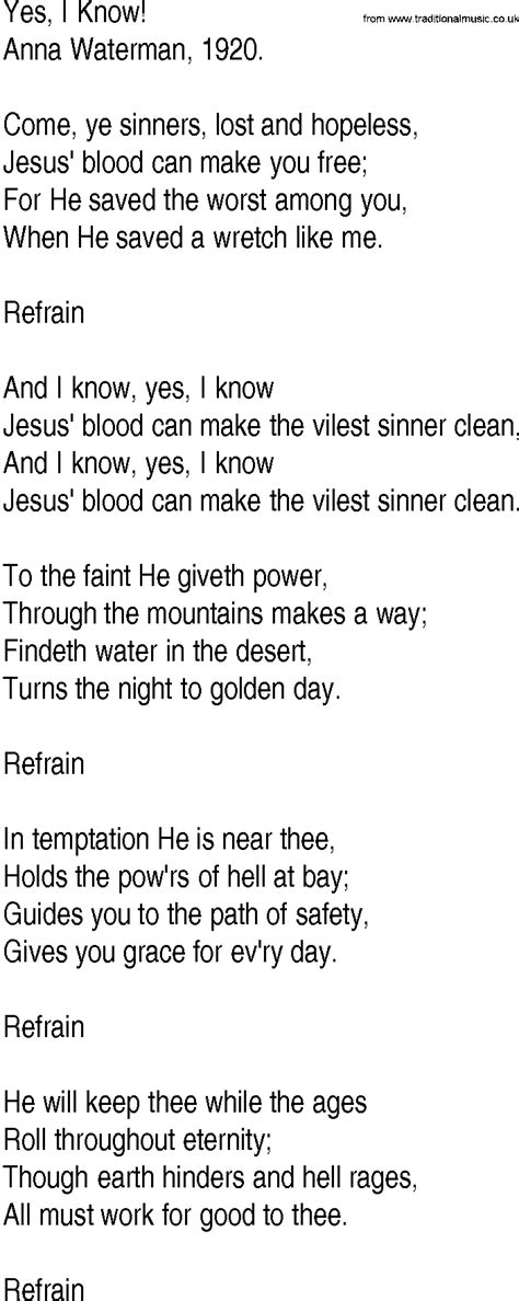Yes I Know Lyrics. Findeth water in the desert, turns. Come, ye sinners, lost and lonely jesus' blood can make you free;