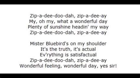 Mister bluebird's on my shoulder. Web 8 hours agothe change to the parade’s lyrics was first reported in the oc register. Karaoke playlists channel uploaded on 25 januari 2023 disney s song of the south zip a dee doo dah. My, oh my what a wonderful day! Web lyrics from song of the south. Zip a dee doo dah, zip a dee ay my, oh my, what a wonderful day! C f c plenty of sunshine, headed my way, f c g c zip a dee doo dah,. Plenty of sunshine, headin' my way zip a dee. My, oh my, what a wonderful day. This is just the kind of day you dream about: